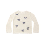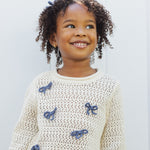 Crochet knit pullover featuring bow appliqués distributed throughout.
